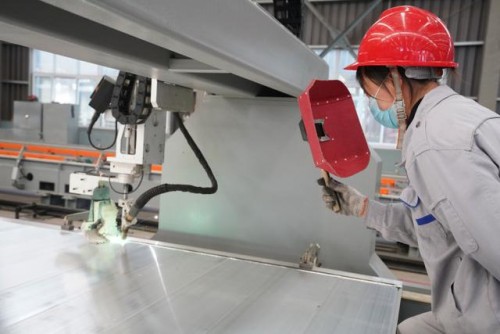 2020年3月14日,山東三星集團(tuán)高端鋁精深加工企業(yè)三星機(jī)械制造有限公司工人在生產(chǎn)快遞用廂車(chē)車(chē)體。