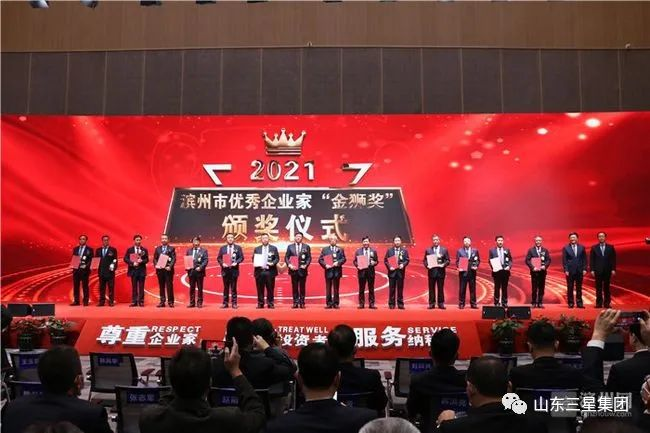 會(huì)議同時(shí)宣讀了《中共濱州市委、濱州市人民政府關(guān)于授予2021濱州市優(yōu)秀企業(yè)家“金獅獎(jiǎng)”“銀獅獎(jiǎng)”“銅獅獎(jiǎng)”和富強(qiáng)濱州建設(shè)“金星獎(jiǎng)”及公布濱州市“智能化綠色化技改十大優(yōu)秀案例”名單的決定》,隆重表彰優(yōu)秀企業(yè)家和獲獎(jiǎng)單位,山東三星集團(tuán)總經(jīng)理王明星榮獲2021濱州市優(yōu)秀企業(yè)家“金獅獎(jiǎng)”。