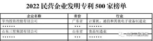 日前,全國工商聯(lián)發(fā)布“2022民營企業(yè)研發(fā)投入500家”“2022民營企業(yè)發(fā)明專利500家”雙榜單,山東三星集團(tuán)科研實(shí)力強(qiáng)勁、專利成果突出,成功入圍“2022民營企業(yè)發(fā)明專利500家”名錄。