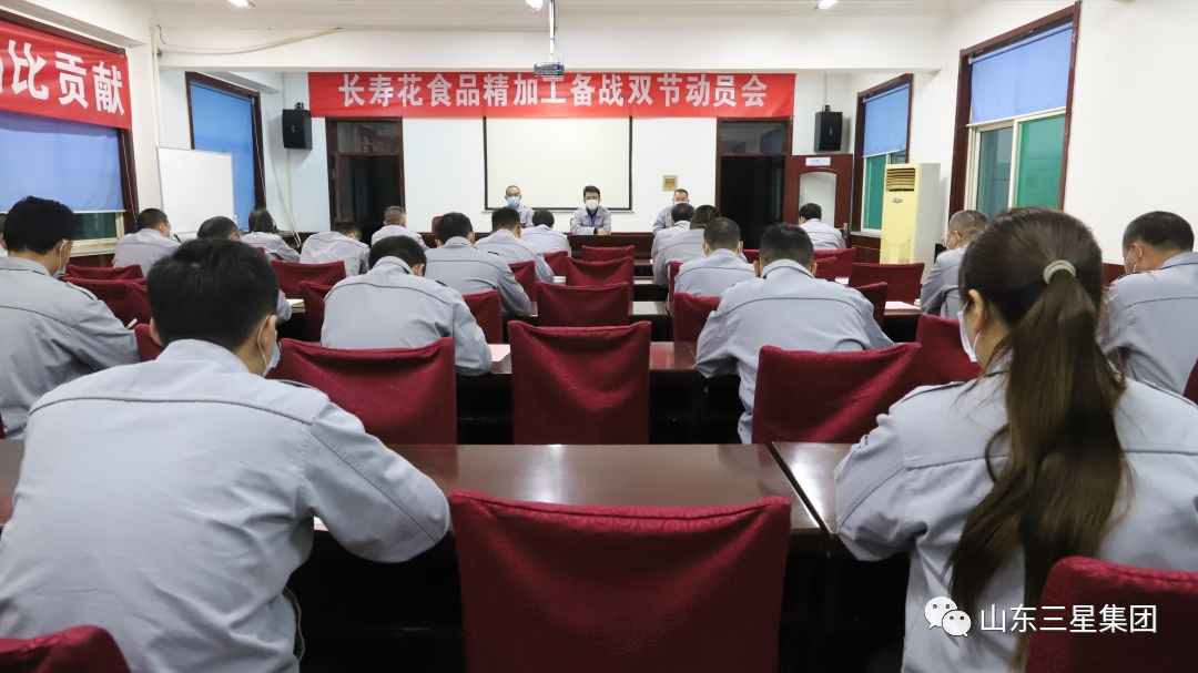 元旦春節(jié)雙節(jié)將近,為進(jìn)一步加大生產(chǎn)、提升效能,保質(zhì)保量完成全年任務(wù)目標(biāo),11月16日,長壽花食品精加工事業(yè)部召開備戰(zhàn)“雙節(jié)”動員大會。山東三星集團(tuán)企管部經(jīng)理程士警,長壽花食品副總經(jīng)理張恒、生產(chǎn)總監(jiān)霍光彬及公司生產(chǎn)、銷售、儲運、設(shè)備、安全部門負(fù)責(zé)人參加會議。
