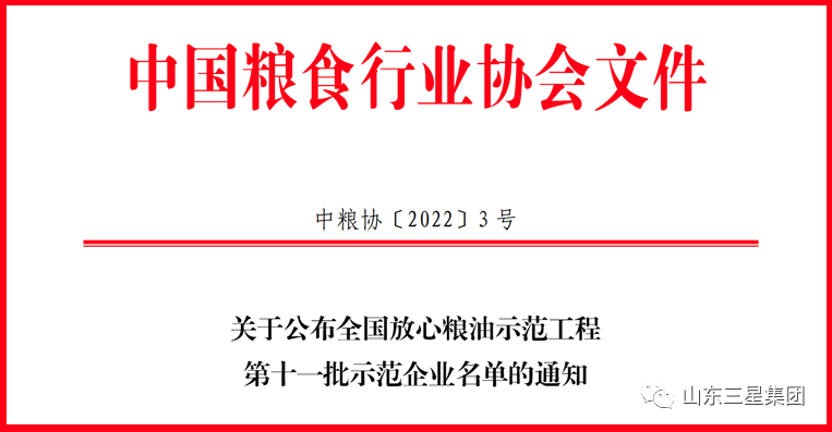 近期,中國(guó)糧食行業(yè)協(xié)會(huì)公布“全國(guó)放心糧油示范工程”第十一批示范企業(yè)名單。山東三星集團(tuán)科技興糧精工品質(zhì),誠(chéng)信保供厚道惠民,榮獲“全國(guó)放心糧油示范工程示范企業(yè)”榮譽(yù)稱(chēng)號(hào),成為山東鄒平唯一一家獲此殊榮的企業(yè)。