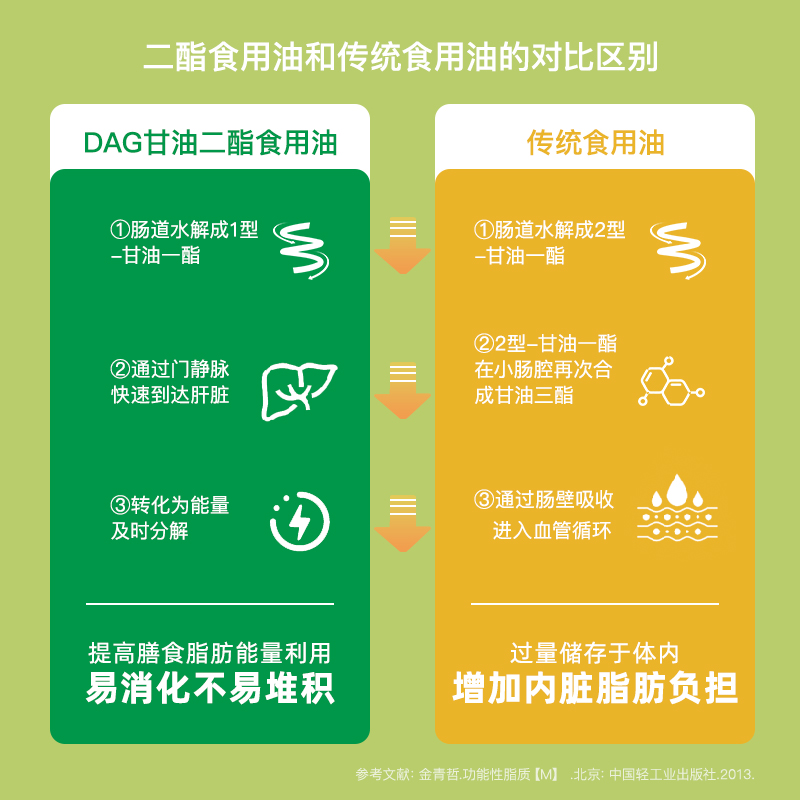 甘油二酯不同于甘油三酯。由于在結(jié)構(gòu)上缺少一個脂肪酸,甘油二酯在經(jīng)小腸粘膜細胞消化吸收后,無法合成甘油三酯結(jié)構(gòu)進入血液,而是由號稱“細胞發(fā)電站”的線粒體代謝供能,不易在體內(nèi)造成脂肪累積。因此廣受關(guān)注。