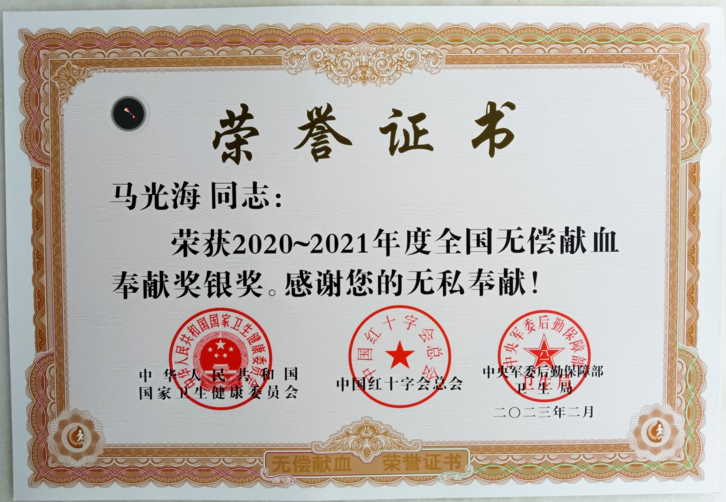 無償獻(xiàn)血,讓愛傳遞。7月14日,一份最有意義的榮譽(yù)證書發(fā)放到通遼公司行政副總經(jīng)理馬光海手中,他因無私獻(xiàn)血榮獲2020—2021年度全國無償獻(xiàn)血奉獻(xiàn)獎銀獎。