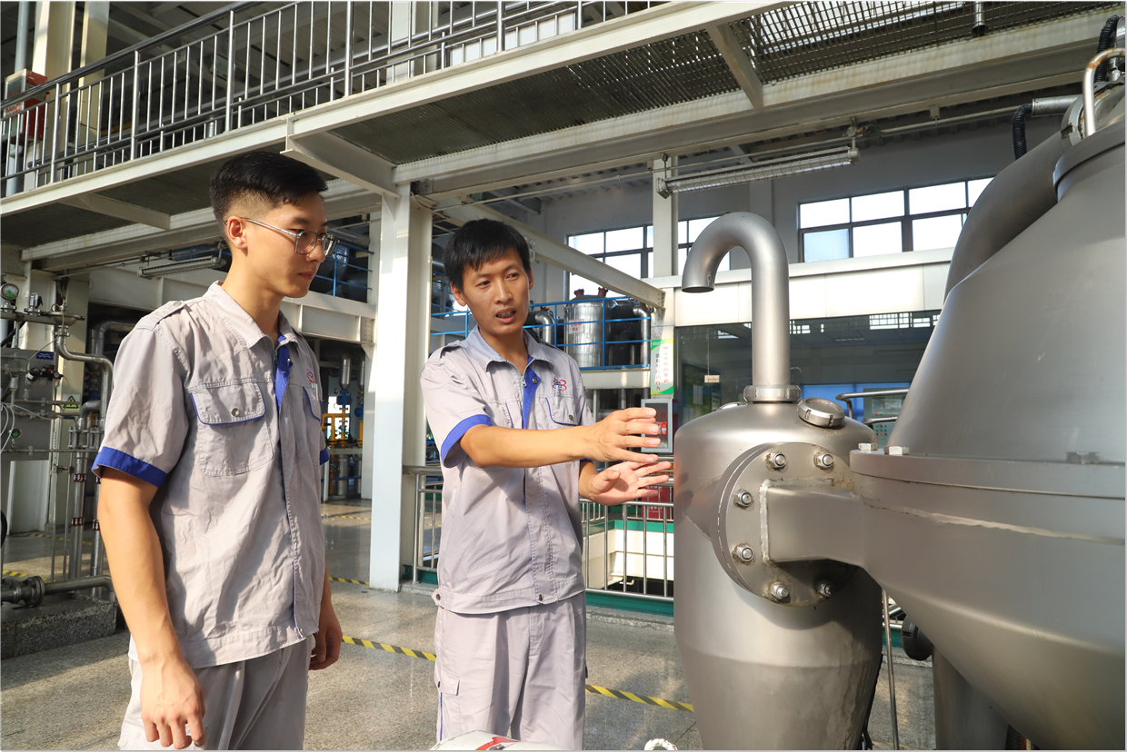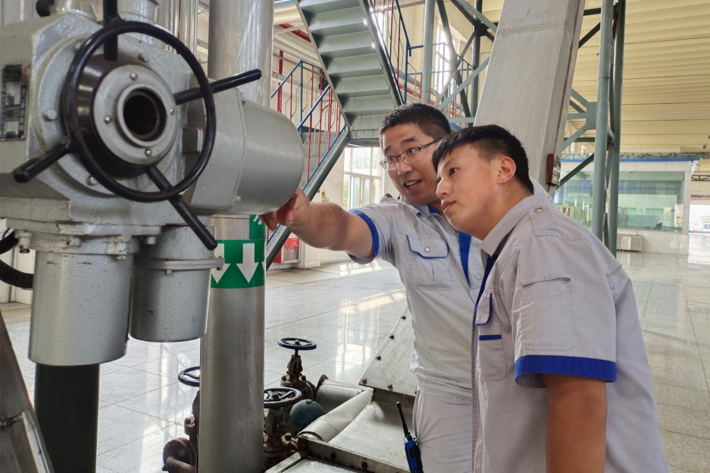 長(zhǎng)壽花食品精煉三車(chē)間,馬海濤(右)向?qū)O慶金講解設(shè)備操作技能,如何做好實(shí)時(shí)監(jiān)測(cè),優(yōu)化工藝指標(biāo),確保高效穩(wěn)定運(yùn)行。這其中,傳授的不僅是技能和經(jīng)驗(yàn),還有初心使命和工作理念,也隨之一同入腦入心,扎實(shí)開(kāi)啟“煉好油”的職業(yè)生涯。