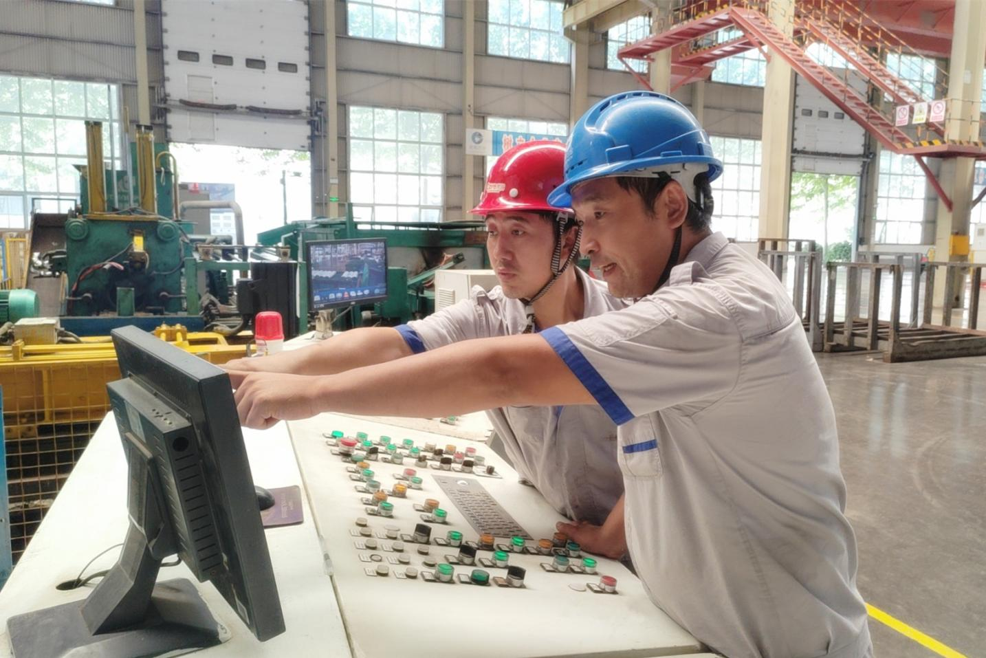 裕航合金擠壓三車(chē)間,26兆牛擠壓機(jī)班長(zhǎng)韓寶磊(右)對(duì)新員工孫雙喜進(jìn)行手把手培訓(xùn),詳細(xì)講解擠壓機(jī)操作技能和工藝單執(zhí)行情況,讓新員工盡快熟悉崗位職責(zé),掌握機(jī)臺(tái)工藝流程及各項(xiàng)指標(biāo)參數(shù),為新員工順利上崗、投入工作發(fā)揮積極傳幫帶作用。