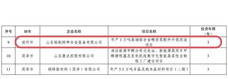 近日,山東省工業(yè)和信息化廳公布了2023年省級(jí)工業(yè)和信息化領(lǐng)域財(cái)政資金股權(quán)投資項(xiàng)目名單(全省共有11家企業(yè)的11個(gè)項(xiàng)目入選),山東裕航特種合金裝備有限公司年產(chǎn)1萬(wàn)噸高端鋁合金精密零配件升級(jí)改造項(xiàng)目成功上榜,獲省級(jí)財(cái)政股權(quán)投資資金4000萬(wàn)元,為濱州市唯一入選項(xiàng)目。