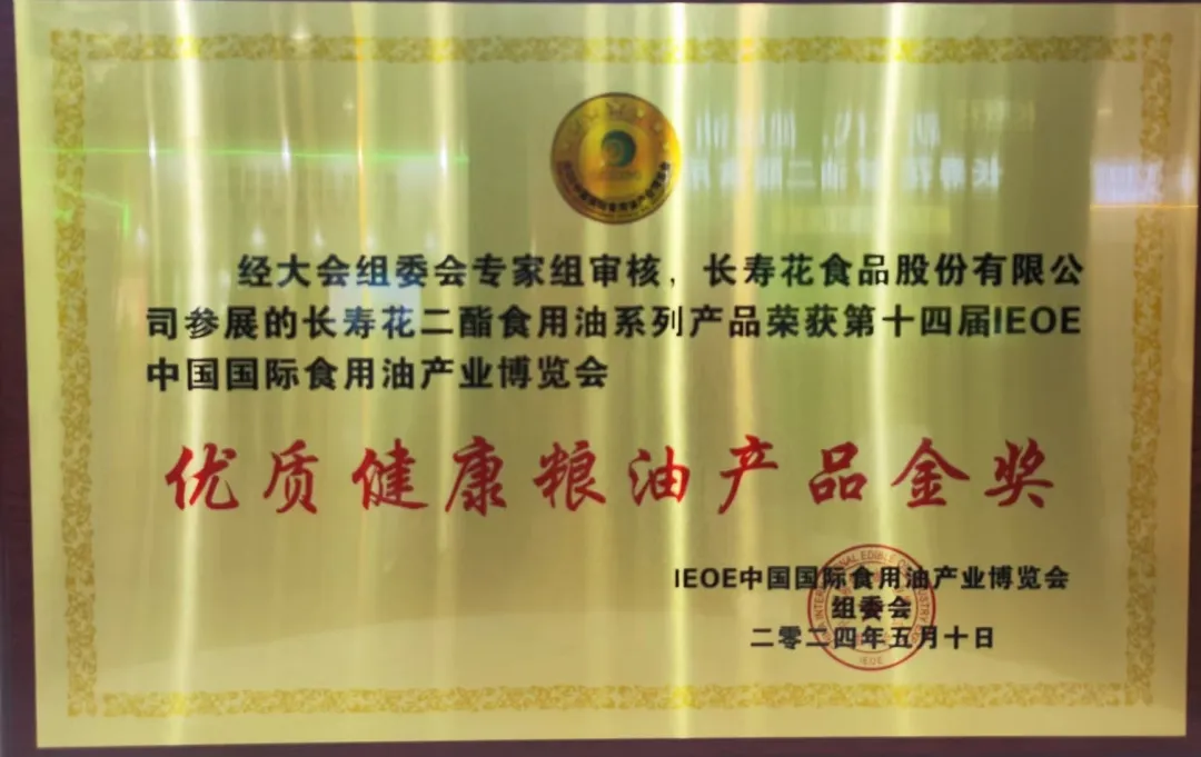 在萬眾矚目的第十四屆IEOE中國油博會、IGPE中國糧油展上,長壽花二酯食用油憑借卓越品質與專業(yè)研發(fā)理念,榮耀加冕“優(yōu)質健康糧油產品金獎”!“優(yōu)質健康糧油產品金獎”不僅是對長壽花二酯食用油的肯定,也是對長壽花食品長期以來致力于推動食用油行業(yè)健康發(fā)展努力的認可。這份榮譽,凝聚了長壽花全體同仁的智慧與汗水,是團隊合作精神的結晶,更是對健康生活倡導的有力回應。