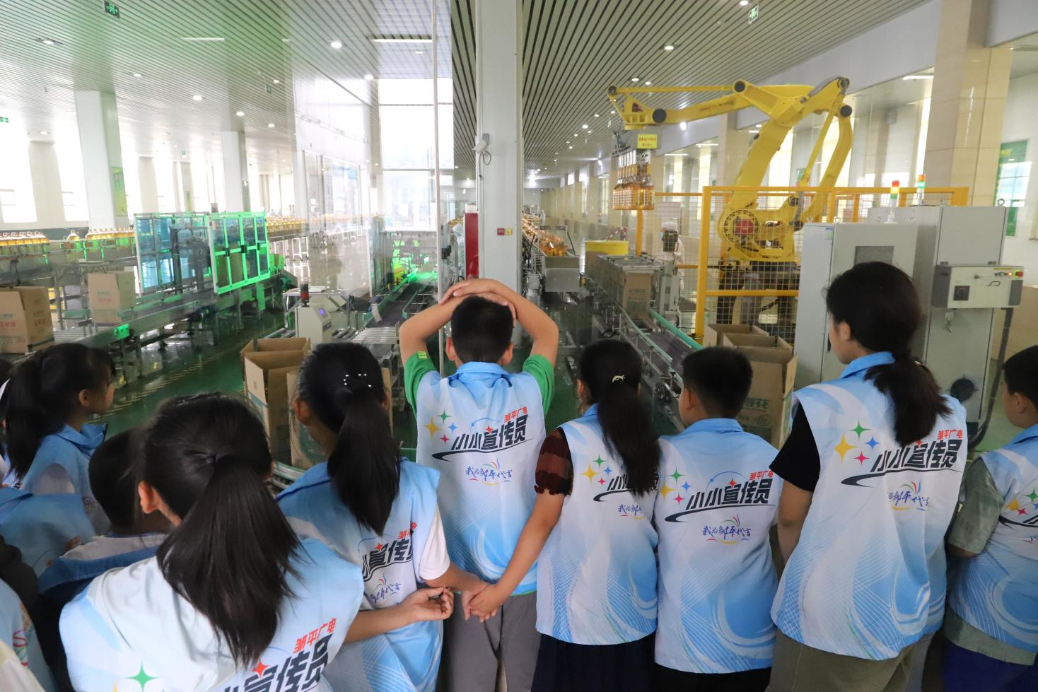 在全自動灌裝包裝車間,機器人不斷揮舞機械臂,一箱箱玉米油整裝待發(fā),孩子們更是興致盎然,透過玻璃感受這撲面而來的現(xiàn)代化智能制造的氣息。