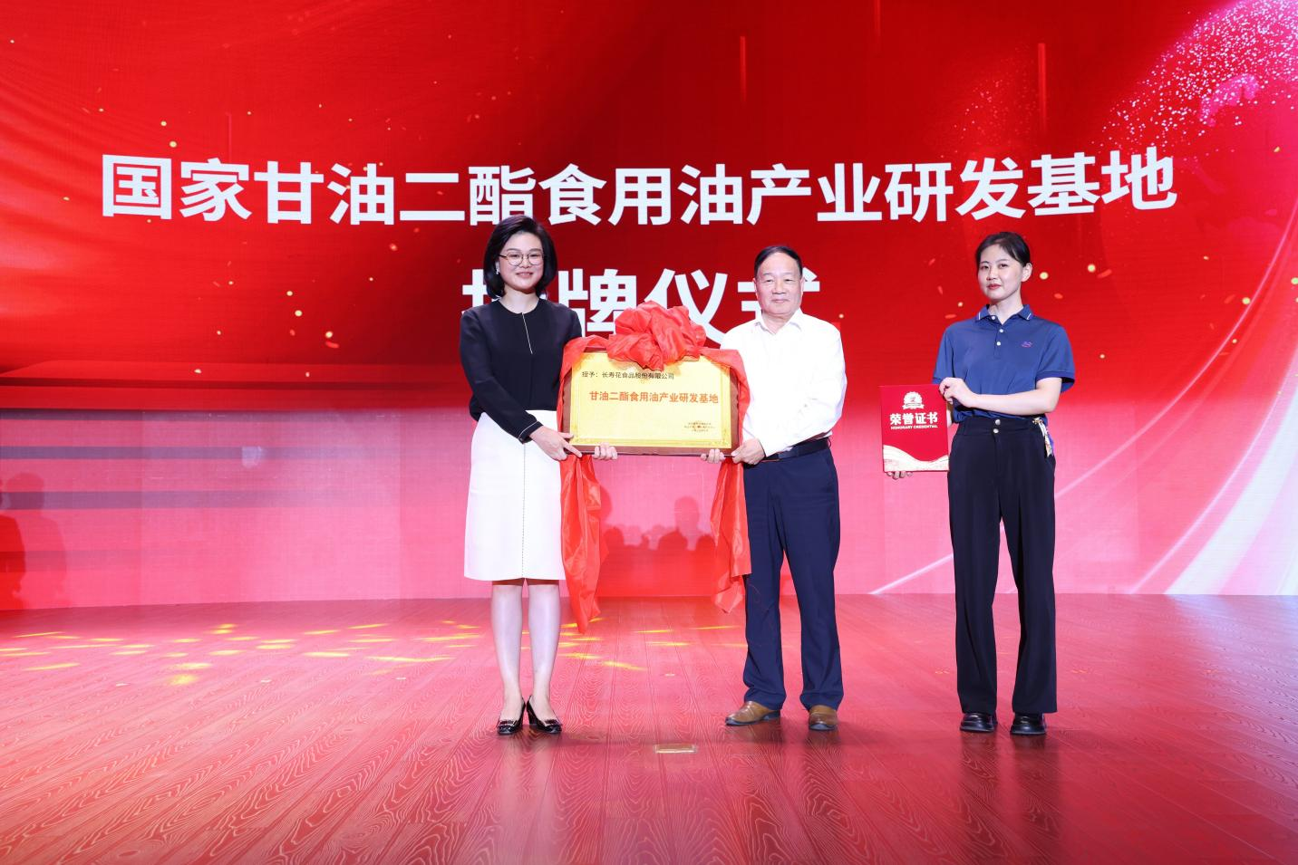 大會(huì)同期舉行了“國家甘油二酯食用油產(chǎn)業(yè)研發(fā)基地”授牌儀式。山東三星集團(tuán)董事長、總裁王亞群從中國糧油學(xué)會(huì)油脂分會(huì)會(huì)長何東平手中接過授牌,這也是繼“國家玉米油產(chǎn)業(yè)研發(fā)基地”后,長壽花獲得的又一國字號(hào)“產(chǎn)業(yè)研發(fā)基地”金字招牌。
