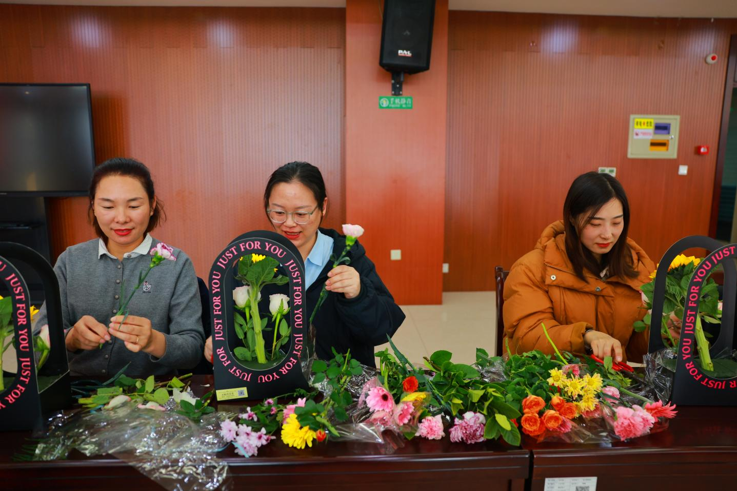 活動現(xiàn)場,專業(yè)花藝老師為大家詳細講解了花卉知識、插花技巧和藝術構圖。女員工們聽得津津有味,從花材的選擇與處理,到色彩搭配和造型設計,不時提出問題,與花藝師積極互動。