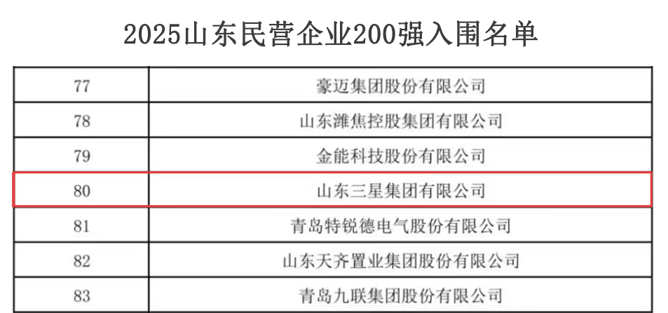 近日,山東省工商聯(lián)發(fā)布2025山東民營(yíng)企業(yè)百?gòu)?qiáng)系列榜單入圍名單,山東三星集團(tuán)上榜山東民營(yíng)企業(yè)200強(qiáng),位列第80位,較去年位次提升12位。集團(tuán)旗下長(zhǎng)壽花食品、裕航合金公司同時(shí)上榜山東民營(yíng)企業(yè)創(chuàng)新100強(qiáng),連續(xù)上榜民企百?gòu)?qiáng)榜單彰顯了企業(yè)在綜合實(shí)力、科創(chuàng)能力及發(fā)展?jié)摿Φ确矫娴膹?qiáng)勁韌性和勢(shì)頭。