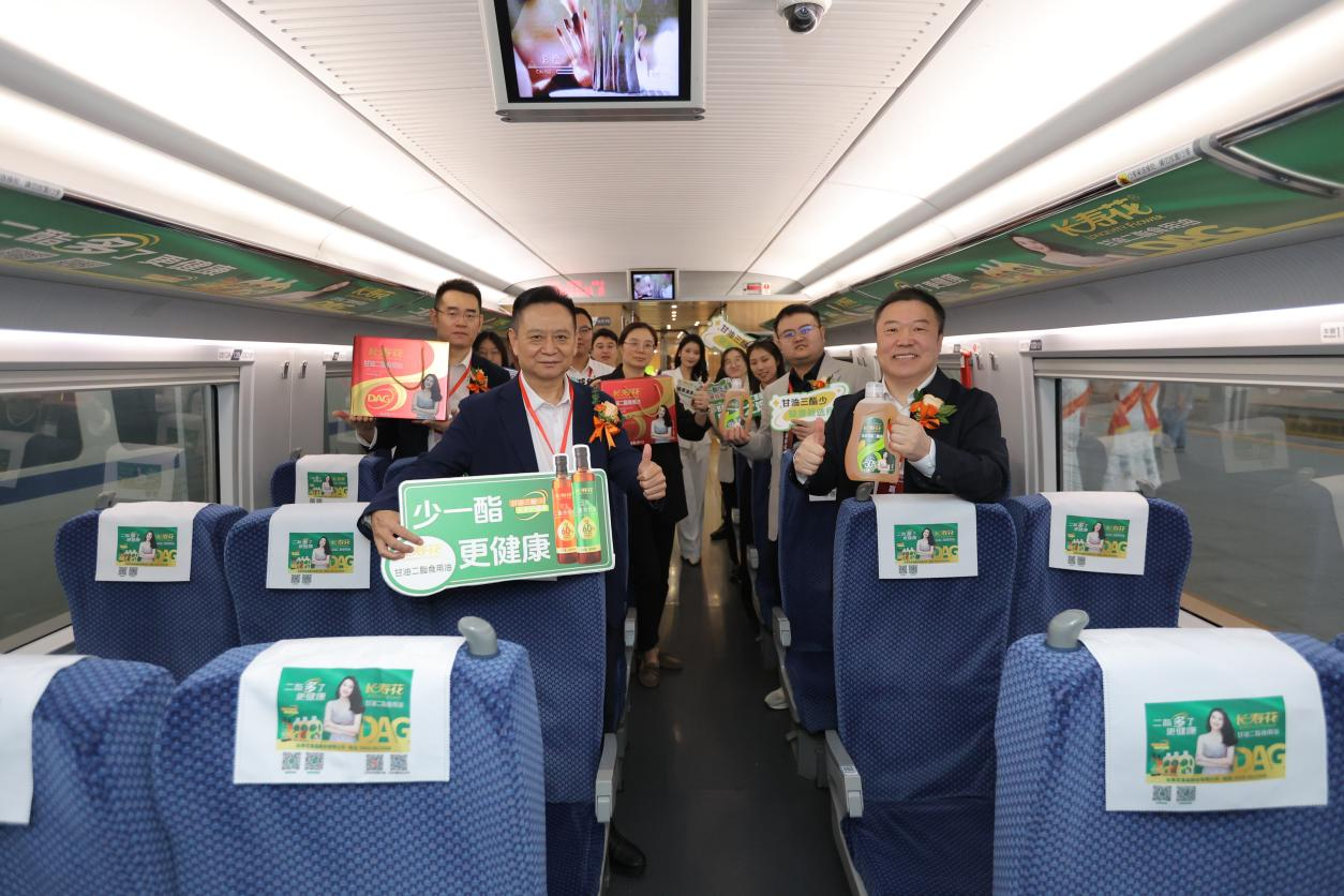 在熱烈的掌聲中,與會領導嘉賓共同為列車首發(fā)剪彩。這場獨具匠心的儀式,一端是長壽花食品帶來的健康新選擇——甘油二酯食用油,以創(chuàng)新科技重新定義健康飲食;另一端則是中國高鐵,以世界矚目的“中國速度”展現(xiàn)國家工業(yè)實力。當健康飲食的“科技力”遇上中國制造的“硬實力”,這不僅是一次品牌跨界,更是創(chuàng)新科技與國家戰(zhàn)略的深度融合,健康中國戰(zhàn)略正搭載新時代發(fā)展快車,全速駛向未來。