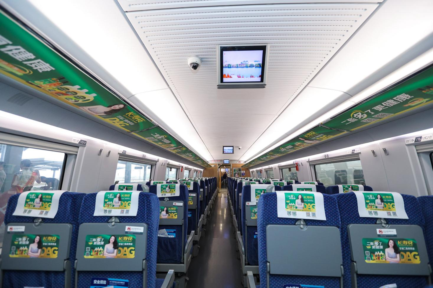 儀式結束后,與會領導一行到達站臺,與“長壽花甘油二酯食用油號”高鐵列車合影,并登上首發(fā)班次冠名列車,實地感受品牌與高鐵場景的深度融合。列車內部構建了以小桌板、頭巾、行李架、海報、字幕等為點位的品牌傳播矩陣,形成360°環(huán)繞式品牌空間。