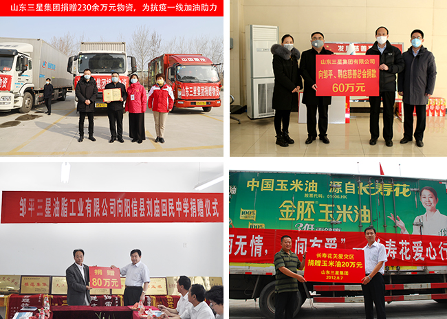 作為根植齊魯大地的“厚道魯商”品牌企業(yè),多年來(lái),山東三星集團(tuán)主動(dòng)承擔(dān)社會(huì)責(zé)任, 熱心公益慈善事業(yè)。疫情捐贈(zèng)、抗洪賑災(zāi)、捐資助學(xué)、扶貧濟(jì)困……,在每一個(gè)危難的時(shí) 刻,在每一處需要幫助的地方,企業(yè)都積極捐款捐物,參與救災(zāi)和各項(xiàng)社會(huì)公益慈善事 業(yè),用實(shí)際行動(dòng)踐行企業(yè)責(zé)任,熱心相助,回報(bào)社會(huì),多次榮獲“最具愛(ài)心企業(yè)”“最具 社會(huì)責(zé)任感集體”及“慈善之星”等榮譽(yù)稱號(hào)。此外,山東三星集團(tuán)每年都積極參與“慈 心一日捐”活動(dòng),堅(jiān)持走訪慰問(wèn)因病因急致困的周邊群眾及職工,在企業(yè)內(nèi)部形成了濃厚 的慈善氛圍。